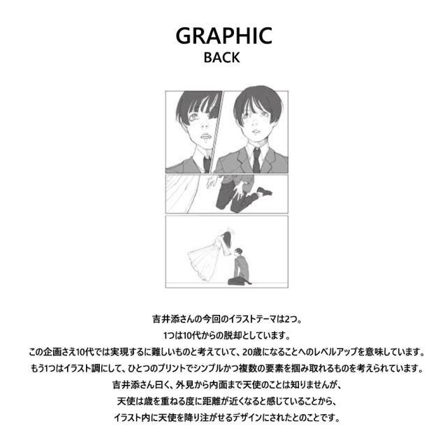 | 商品Data | 吉井添さんを迎えたPIKO KAILA コラボレーション企画! 今回はZIPパーカーをご用意! 【デザイン】 吉井添さんの今回のイラストテーマは2つ。 1つは10代からの脱却としています。この企画さえ10代では実現するに難しいものと考えていて、20歳になることへのレベルアップを意味しています。 もう1つはイラスト調にして、ひとつのプリントでシンプルかつ複数の要素を掴み取れるものを考えられています。 吉井添さん曰く、外見から内面まで天使のことは知りませんが、天使は歳を重ねる度に距離が近くなると感じていることから、イラスト内に天使を降り注がせるデザインにされたとのことです。 ※現時点での商品の発送予定時期は【12月 中旬頃~2月中旬頃順次発送】を予定しております。 尚、工場の生産の都合上、お客様のご入金・決済のタイミングにより前後する場合がございます。 予めご了承ください。 ※商品によっては撮影時にサンプルを使用しているため若干仕様が異なる場合がございます。 また、サイズ・カラーによっては仕様が異なる場合もございます。 ※手作業で縫製をしているため縫製の仕様により、 個体差が生じてしまいますので、1~2cm程度の誤差は予めご了承くださいませ。 ※洗濯機を使用した場合、お届け時のサイズより多少縮む場合がございます。 洗濯機を使用する場合は裏返してネットに入れることを推奨しております。 また、タンブラー乾燥機を使用しますとプリントが剥がれる恐れがありますので 避けていただきますようお願いいたします。 また、洗濯時の液温は40度以下とし、 塩素系および酸素系漂白剤の使用は避けていただきますようお願いいたします。 アイロンにつきましてもプリント及び刺繍部分は避け、 生地部分にアイロンをかける場合にはあて布をして110度(低温)にてお願いいたします。 ※また、受注生産とさせていただいておりますが、 各色・サイズ毎に生産数に限りがございます為、 生産数の上限に達しました場合在庫切れとなる場合がございます。 予めご了承頂けますようお願い致します。 |