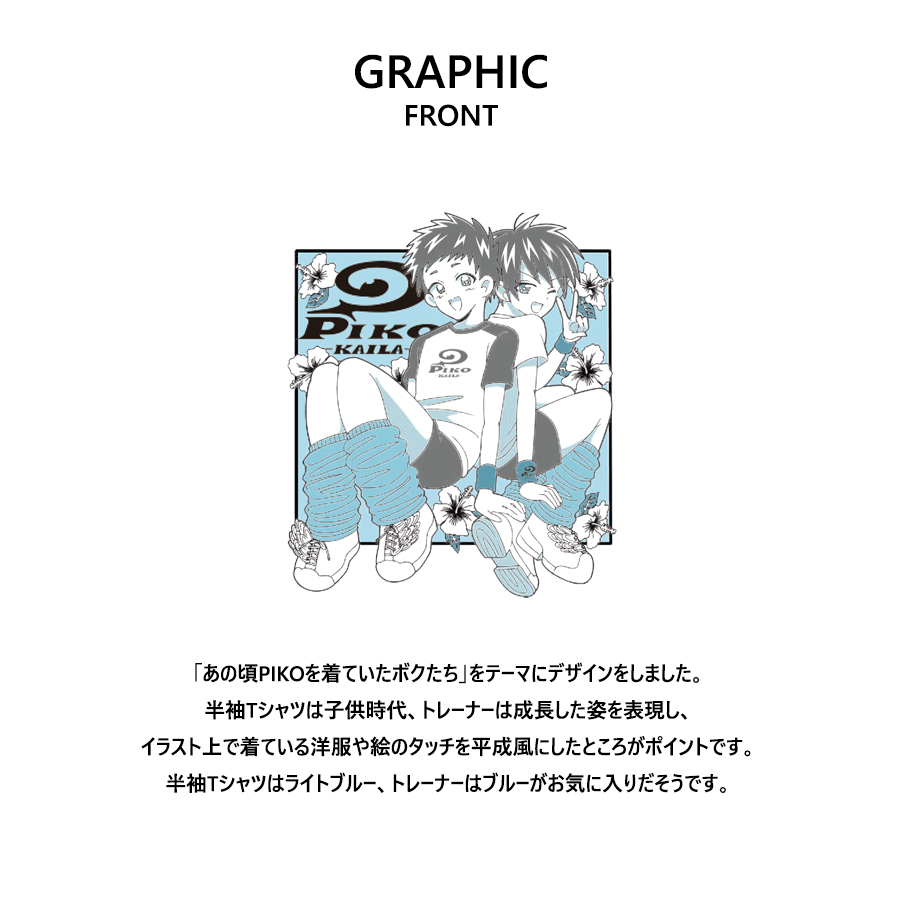 | 商品Data | 江崎びす子さんを迎えたPIKO KAILA コラボレーション企画! 今回は半袖Tシャツとトレーナーをご用意! 【デザイン】 「あの頃PIKOを着ていたボクたち」をテーマにデザインをしました。 半袖Tシャツは子供時代、トレーナーは成長した姿を表現し、 イラスト上で着ている洋服や絵のタッチを平成風にしたところがポイントです。 半袖Tシャツはライトブルー、トレーナーはブルーがお気に入りだそうです。 ※現時点での商品の発送予定時期は【2月下旬頃~3月下旬頃順次発送】を予定しております。 尚、工場の生産の都合上、お客様のご入金・決済のタイミングにより前後する場合がございます。 予めご了承ください。 ※商品によっては撮影時にサンプルを使用しているため若干仕様が異なる場合がございます。 また、サイズ・カラーによっては仕様が異なる場合もございます。 ※手作業で縫製をしているため縫製の仕様により、 個体差が生じてしまいますので、1~2cm程度の誤差は予めご了承くださいませ。 ※洗濯機を使用した場合、お届け時のサイズより多少縮む場合がございます。 洗濯機を使用する場合は裏返してネットに入れることを推奨しております。 また、タンブラー乾燥機を使用しますとプリントが剥がれる恐れがありますので 避けていただきますようお願いいたします。 また、洗濯時の液温は40度以下とし、 塩素系および酸素系漂白剤の使用は避けていただきますようお願いいたします。 アイロンにつきましてもプリント及び刺繍部分は避け、 生地部分にアイロンをかける場合にはあて布をして110度(低温)にてお願いいたします。 ※また、受注生産とさせていただいておりますが、 各色・サイズ毎に生産数に限りがございます為、 生産数の上限に達しました場合在庫切れとなる場合がございます。 予めご了承頂けますようお願い致します。 |