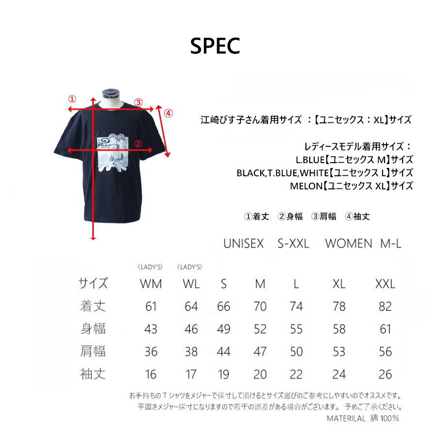 | サイズ | 【レディースサイズ】 レディース:M■着丈61cm,身幅43cm,肩幅36cm,袖丈16cm レディース:L■着丈64cm,身幅46cm,肩幅38cm,袖丈17cm 【ユニセックスサイズ】 ユニセックス:S■着丈66cm,身幅49cm,肩幅44cm,袖丈19cm ユニセックス:M■着丈70cm,身幅52cm,肩幅47cm,袖丈20cm ユニセックス:L■着丈74cm,身幅55cm,肩幅50cm,袖丈22cm ユニセックス:XL■着丈78cm,身幅58cm,肩幅53cm,袖丈24cm ユニセックス:XXL■着丈82cm,身幅61cm,肩幅56cm,袖丈26cm ★撮影時に江崎びす子さん着用サイズは【ユニセックス:XL】サイズです。 ★レディースモデル着用サイズは L.BLUE【ユニセックス:M】サイズ BLACK,T.BLUE,WHITE【ユニセックス:L】サイズ MELON【ユニセックス:XL】サイズです。 BLACK,T.BLUE,WHITE レディースモデル身長:155cm L.BLUE,MELON レディースモデル身長:149cm |