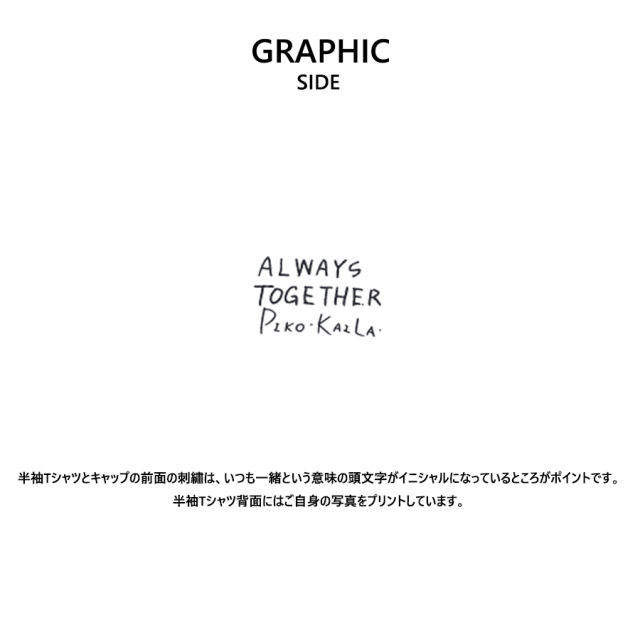 | 商品Data | 豊永阿紀さんを迎えたPIKO KAILA コラボレーション企画! 今回は半袖Tシャツとキャップをリリース! 【デザイン】 半袖Tシャツとキャップの前面の刺繡は、いつも一緒という意味の頭文字がイニシャルになっているところがポイントです。 半袖Tシャツ背面にはご自身の写真をプリントしています。 ※現時点での商品の発送予定時期は【8月中旬頃~10月下旬頃順次発送】を予定しております。 ※S.BLUEのお色につきましては生産の都合上、10月上旬頃順次発送となります。 尚、工場の生産の都合上、お客様のご入金・決済のタイミングにより前後する場合がございます。 予めご了承ください。 ※商品代金が10万円以上にて代引き決済を利用してのご注文につきましては、 トラブル防止のため、決済方法をクレジットカード決済もしくはコンビニ決済に変更 させていただく場合がございます。変更前にお電話、メールにてご連絡をさせていただきます。※ ※商品によっては撮影時にサンプルを使用しているため若干仕様が異なる場合がございます。 また、サイズ・カラーによっては仕様が異なる場合もございます。 ※手作業で縫製をしているため縫製の仕様により、 個体差が生じてしまいますので、1~2cm程度の誤差は予めご了承くださいませ。 ※洗濯機を使用した場合、お届け時のサイズより多少縮む場合がございます。 また、乾燥機の使用は避けていただきますようお願いいたします。 ※また、受注生産とさせていただいておりますが、 各色・サイズ毎に生産数に限りがございます為、 生産数の上限に達しました場合在庫切れとなる場合がございます。 |