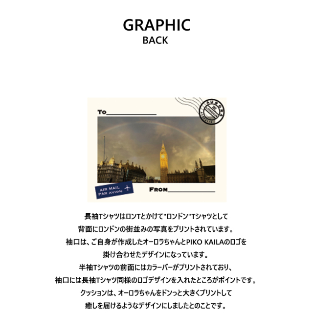 | 商品Data | 岩永徹也さんを迎えたPIKO KAILA コラボレーション企画第2弾! 今回は半袖Tシャツ、長袖Tシャツ、クッションをリリース! 【デザイン】 長袖TシャツはロンTとかけて"ロンドン"Tシャツとして 背面にロンドンの街並みの写真をプリントされています。 袖口は、ご自身が作成したオーロラちゃんとPIKO KAILAのロゴを 掛け合わせたデザインになっています。 半袖Tシャツの前面にはカラーバーがプリントされており、 袖口には長袖Tシャツ同様のロゴデザインを入れたところがポイントです。 クッションは、オーロラちゃんをドンっと大きくプリントして 癒しを届けるようなデザインにしましたとのことです。 ※商品の発送予定時期は 【8月中旬頃~8月下旬頃順次発送予定】となります。 ※受注生産の為、発送予定時期が前後する場合がございます。 ※高額注文の場合には ご注文後にお電話にてご連絡をさせていただく場合がございます。 お電話にてご連絡が取れない場合にはメールにてご連絡させていただき、 ご連絡日より3日以内にご返信をいただけない場合には不正注文の可能性があると判断し トラブル防止のためご注文をキャンセルとさせていただきます。 ※商品によっては撮影時にサンプルを使用しているため若干仕様が異なる場合がございます。 また、サイズ・カラーによっては仕様が異なる場合もございます。 ※手作業で縫製をしているため縫製の仕様により、 個体差が生じてしまいますので、1~2cm程度の誤差は予めご了承くださいませ。 ※洗濯機を使用した場合、お届け時のサイズより多少縮む場合がございます。 洗濯機を使用する場合は裏返してネットに入れることを推奨しております。 また、タンブラー乾燥機を使用しますとプリントが剥がれる恐れがありますので 避けていただきますようお願いいたします。 また、洗濯時の液温は40度以下とし、 塩素系および酸素系漂白剤の使用は避けていただきますようお願いいたします。 アイロンにつきましてもプリント及び刺繍部分は避け、 生地部分にアイロンをかける場合にはあて布をして110度(低温)にてお願いいたします。 ※また、受注生産とさせていただいておりますが、 各色・サイズ毎に生産数に限りがございます為、 生産数の上限に達しました場合在庫切れとなる場合がございます。 |