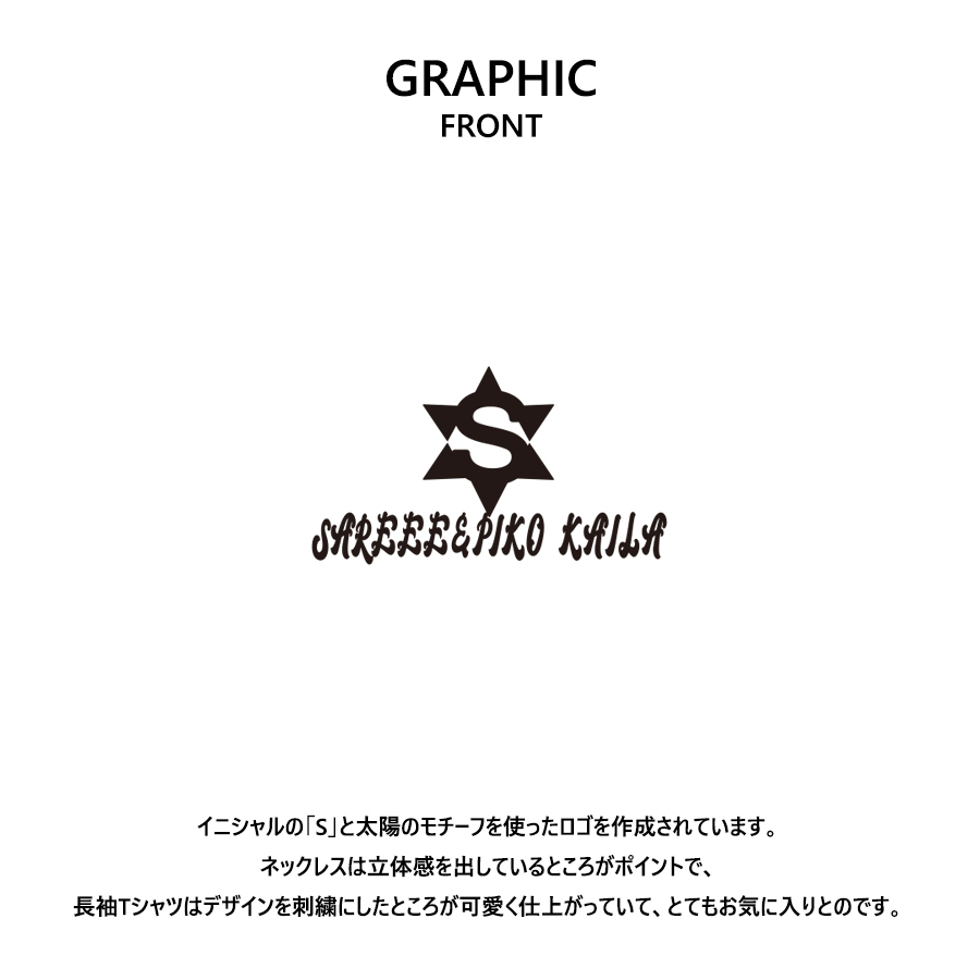 | 商品Data | Sareeeさんを迎えたPIKO KAILA コラボレーション企画! 今回は長袖Tシャツ、キャップ、ネックレスをリリース! 【デザイン】 イニシャルの「S」と太陽のモチーフを使ったロゴを作成されています。 ネックレスは立体感を出しているところがポイントで、 長袖Tシャツはデザインを刺繍にしたところが可愛く仕上がっていて、とてもお気に入りとのです。 ※現時点での商品の発送予定時期は【2月上旬頃~2月中旬頃順次発送予定】を予定しております。 尚、工場の生産の都合上、お客様のご入金・決済のタイミングにより前後する場合がございます。 予めご了承ください。 ※商品代金が10万円以上にて代引き決済を利用してのご注文につきましては、 トラブル防止のため、決済方法をクレジットカード決済もしくはコンビニ決済に変更 させていただく場合がございます。変更前にお電話、メールにてご連絡をさせていただきます。※ ※商品によっては撮影時にサンプルを使用しているため若干仕様が異なる場合がございます。 また、サイズ・カラーによっては仕様が異なる場合もございます。 ※手作業で縫製をしているため縫製の仕様により、 個体差が生じてしまいますので、1~2cm程度の誤差は予めご了承くださいませ。 ※洗濯機を使用した場合、お届け時のサイズより多少縮む場合がございます。 また、乾燥機の使用は避けていただきますようお願いいたします。 ※また、受注生産とさせていただいておりますが、 各色・サイズ毎に生産数に限りがございます為、 生産数の上限に達しました場合在庫切れとなる場合がございます。 |