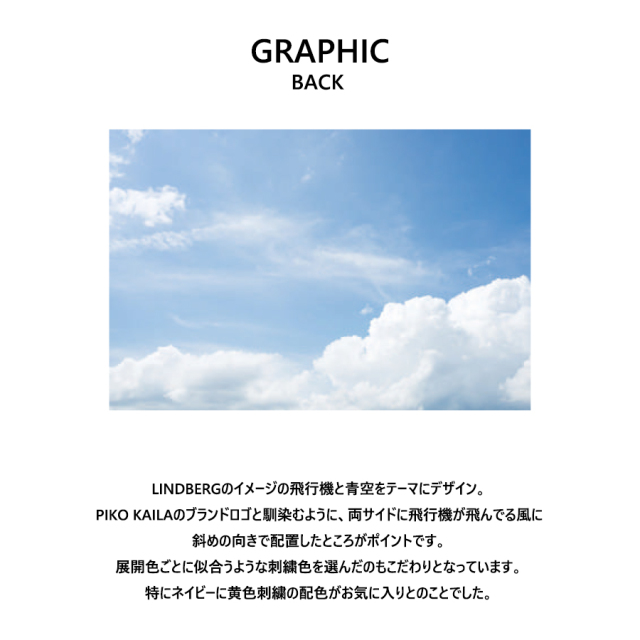 | 商品Data | LINDBERGさんを迎えたPIKO KAILAコラボレーション企画! 今回はトレーナーとZIPパーカーをご用意! 【デザイン】 LINDBERGのイメージの飛行機と青空をテーマにデザイン。 PIKO KAILAのブランドロゴと馴染むように、 両サイドに飛行機が飛んでる風に斜めの向きで配置したところがポイントです。 展開色ごとに似合うような刺繍色を選んだのもこだわりとなっています。 特にネイビーに黄色刺繍の配色がお気に入りとのことでした。 ※現時点での商品の発送予定時期は【11月上旬頃~11月中旬頃順次発送】を予定しております。 尚、工場の生産の都合上、お客様のご入金・決済のタイミングにより前後する場合がございます。 予めご了承ください。 ※商品によっては撮影時にサンプルを使用しているため若干仕様が異なる場合がございます。 また、サイズ・カラーによっては仕様が異なる場合もございます。 ※手作業で縫製をしているため縫製の仕様により、 個体差が生じてしまいますので、1~2cm程度の誤差は予めご了承くださいませ。 ※洗濯機を使用した場合、お届け時のサイズより多少縮む場合がございます。 洗濯機を使用する場合は裏返してネットに入れることを推奨しております。 また、タンブラー乾燥機を使用しますとプリントが剥がれる恐れがありますので 避けていただきますようお願いいたします。 また、洗濯時の液温は40度以下とし、 塩素系および酸素系漂白剤の使用は避けていただきますようお願いいたします。 アイロンにつきましてもプリント及び刺繍部分は避け、 生地部分にアイロンをかける場合にはあて布をして110度(低温)にてお願いいたします。 ※また、受注生産とさせていただいておりますが、 各色・サイズ毎に生産数に限りがございます為、 生産数の上限に達しました場合在庫切れとなる場合がございます。 予めご了承頂けますようお願い致します。 |