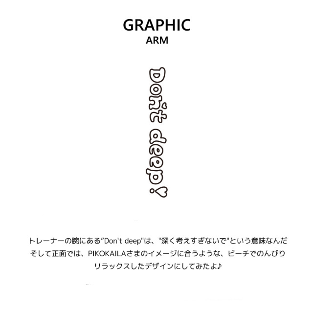 | 商品Data | あさみみちゃんさんを迎えたPIKO KAILAコラボレーション企画! 今回はトレーナー、ネックレス、ブレスレットをご用意! 【デザイン】 トレーナーの腕にある”Don't deep"は、"深く考えすぎないで"という意味なんだ❣️ そして正面では、PIKOKAILAさまのイメージに合うような、ビーチでのんびりリラックスしたデザインにしてみたよ♪ ※現時点での商品の発送予定時期は【1月下旬頃~2月上旬頃順次発送】を予定しております。 尚、工場の生産の都合上、お客様のご入金・決済のタイミングにより前後する場合がございます。 予めご了承ください。 ※商品によっては撮影時にサンプルを使用しているため若干仕様が異なる場合がございます。 また、サイズ・カラーによっては仕様が異なる場合もございます。 ※手作業で縫製をしているため縫製の仕様により、 個体差が生じてしまいますので、1~2cm程度の誤差は予めご了承くださいませ。 ※洗濯機を使用した場合、お届け時のサイズより多少縮む場合がございます。 洗濯機を使用する場合は裏返してネットに入れることを推奨しております。 また、タンブラー乾燥機を使用しますとプリントが剥がれる恐れがありますので 避けていただきますようお願いいたします。 また、洗濯時の液温は40度以下とし、 塩素系および酸素系漂白剤の使用は避けていただきますようお願いいたします。 アイロンにつきましてもプリント及び刺繍部分は避け、 生地部分にアイロンをかける場合にはあて布をして110度(低温)にてお願いいたします。 ※また、受注生産とさせていただいておりますが、 各色・サイズ毎に生産数に限りがございます為、 生産数の上限に達しました場合在庫切れとなる場合がございます。 予めご了承頂けますようお願い致します。 |