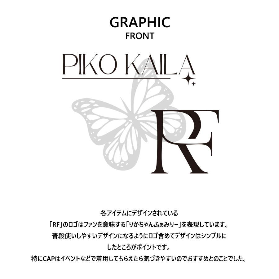 | 商品Data | 中川梨花さんを迎えたPIKO KAILA コラボレーション企画! 今回は長袖Tシャツ、スウェットパンツ、キャップをリリース! 【デザイン】 各アイテムにデザインされている 「RF」のロゴはファンを意味する「りかちゃんふぁみりー」を表現しています。 普段使いしやすいデザインになるようにロゴ含めてデザインはシンプルに したところがポイントです。 特にCAPはイベントなどで着用してもらえたら気づきやすいのでおすすめとのことでした。 ※現時点での商品の発送予定時期は【6月上旬頃順次発送予定】となります。 尚、工場の生産の都合上、お客様のご入金・決済のタイミングにより前後する場合がございます。 予めご了承ください。 ※商品によっては撮影時にサンプルを使用しているため若干仕様が異なる場合がございます。 また、サイズ・カラーによっては仕様が異なる場合もございます。 ※手作業で縫製をしているため縫製の仕様により、個体差が生じてしまいますので、1~2cm程度の誤差は予めご了承くださいませ。 ※洗濯機を使用した場合、お届け時のサイズより多少縮む場合がございます。 洗濯機を使用する場合は裏返してネットに入れることを推奨しております。 また、タンブラー乾燥機を使用しますとプリントが剥がれる恐れがありますので 避けていただきますようお願いいたします。 また、洗濯時の液温は40度以下とし、塩素系および酸素系漂白剤の使用は避けていただきますようお願いいたします。 アイロンにつきましてもプリント及び刺繍部分は避け、 生地部分にアイロンをかける場合にはあて布をして110度(低温)にてお願いいたします。 ※また、受注生産とさせていただいておりますが、 各色・サイズ毎に生産数に限りがございます為、 生産数の上限に達しました場合在庫切れとなる場合がございます。 予めご了承頂けますようお願い致します。 |