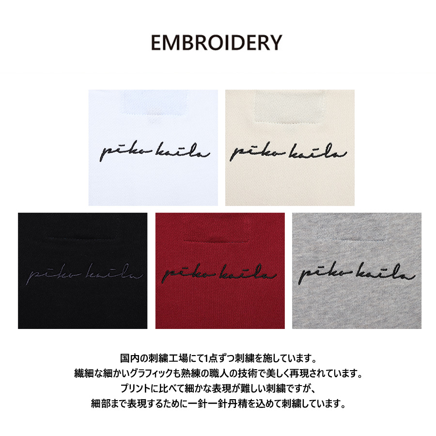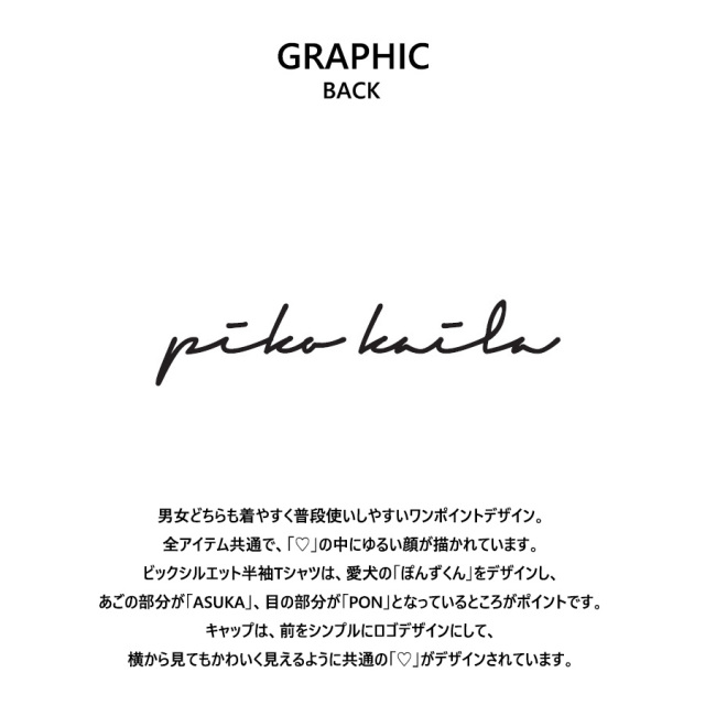 | 商品Data | 岸明日香さんを迎えたPIKO KAILAコラボレーション企画! 今回はビッグシルエット半袖Tシャツ、トレーナー、スウェットパンツ、キャップをご用意! 【デザイン】 男女どちらも着やすく普段使いしやすいワンポイントデザイン。 全アイテム共通で、「♡」の中にゆるい顔が描かれています。 ビックシルエット半袖Tシャツは、愛犬の「ぽんずくん」をデザインし、 あごの部分が「ASUKA」、目の部分が「PON」となっているところがポイントです。 キャップは、前をシンプルにロゴデザインにして、横から見てもかわいく見えるように共通の「♡」がデザインされています。 ※現時点での商品の発送予定時期は【11月上旬~11月中旬頃順次発送予定】となります。 尚、工場の生産の都合上、お客様のご入金・決済のタイミングにより前後する場合がございます。 予めご了承ください。 ※商品によっては撮影時にサンプルを使用しているため若干仕様が異なる場合がございます。 また、サイズ・カラーによっては仕様が異なる場合もございます。 ※手作業で縫製をしているため縫製の仕様により、 個体差が生じてしまいますので、1~2cm程度の誤差は予めご了承くださいませ。 ※洗濯機を使用した場合、お届け時のサイズより多少縮む場合がございます。 洗濯機を使用する場合は裏返してネットに入れることを推奨しております。 また、タンブラー乾燥機を使用しますとプリントが剥がれる恐れがありますので 避けていただきますようお願いいたします。 また、洗濯時の液温は40度以下とし、 塩素系および酸素系漂白剤の使用は避けていただきますようお願いいたします。 アイロンにつきましてもプリント及び刺繍部分は避け、 生地部分にアイロンをかける場合にはあて布をして110度(低温)にてお願いいたします。 ※また、受注生産とさせていただいておりますが、 各色・サイズ毎に生産数に限りがございます為、 生産数の上限に達しました場合在庫切れとなる場合がございます。 予めご了承頂けますようお願い致します。 |