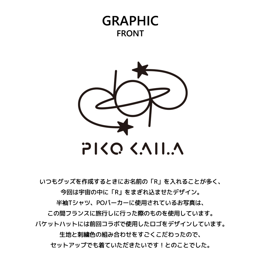 | 商品Data | 里菜さんとのコラボ企画第3弾! 今回のコラボは半袖Tシャツ、プルオーバーパーカー、スウェットパンツ、バケットハットをリリース。 【デザイン】 いつもグッズを作成するときにお名前の「R」を入れることが多く、今回は宇宙の中に「R」をまぎれ込ませたデザイン。 半袖Tシャツ、POパーカーに使用されているお写真は、この間フランスに旅行しに行った際のものを使用しています。 バケットハットには前回コラボで使用したロゴをデザインしています。 生地と刺繍色の組み合わせをすごくこだわったので、セットアップでも着ていただきたいです!とのことでした。 ※商品の発送予定時期は【4月下旬頃~5月上旬頃順次発送予定】となります。 ※受注生産の為、発送予定時期が前後する場合がございます。 ※高額注文の場合には ご注文後にお電話にてご連絡をさせていただく場合がございます。 お電話にてご連絡が取れない場合にはメールにてご連絡させていただき、 ご連絡日より3日以内にご返信をいただけない場合には不正注文の可能性があると判断し トラブル防止のためご注文をキャンセルとさせていただきます。 ※商品によっては撮影時にサンプルを使用しているため若干仕様が異なる場合がございます。 また、サイズ・カラーによっては仕様が異なる場合もございます。 ※手作業で縫製をしているため縫製の仕様により、 個体差が生じてしまいますので、1~2cm程度の誤差は予めご了承くださいませ。 ※洗濯機を使用した場合、お届け時のサイズより多少縮む場合がございます。 洗濯機を使用する場合は裏返してネットに入れることを推奨しております。 また、タンブラー乾燥機を使用しますとプリントが剥がれる恐れがありますので 避けていただきますようお願いいたします。 また、洗濯時の液温は40度以下とし、 塩素系および酸素系漂白剤の使用は避けていただきますようお願いいたします。 アイロンにつきましてもプリント及び刺繍部分は避け、 生地部分にアイロンをかける場合にはあて布をして110度(低温)にてお願いいたします。 ※また、受注生産とさせていただいておりますが、 各色・サイズ毎に生産数に限りがございます為、 生産数の上限に達しました場合在庫切れとなる場合がございます。 |